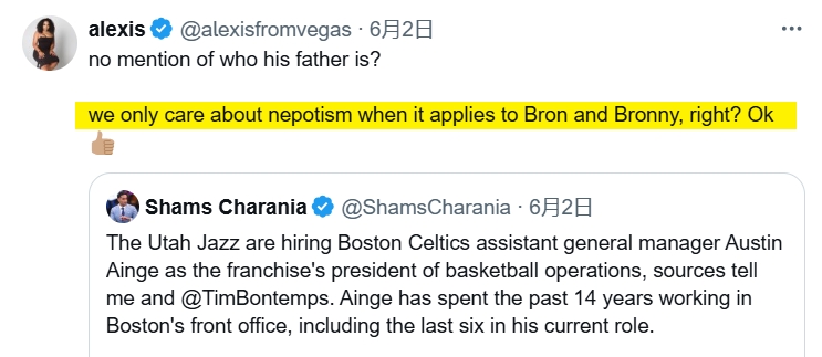 媒体人Alexis就批评Shams说:“不提他的爸爸是谁?所以我们只在勒布朗和布朗尼身上才谈论‘裙带关系’是吗?OK”